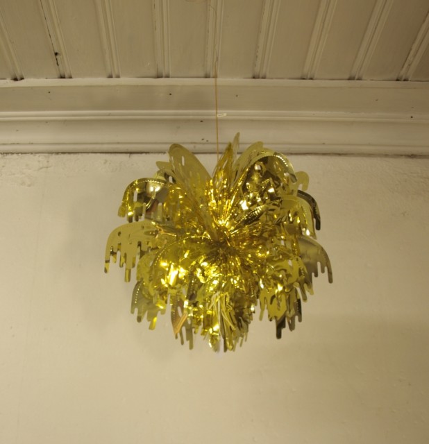 Glitrende gullglanset rund bukett til oppheng i tak eller vindu. Overflaten er i plast med et karakteristisk metallutrykk og flott fargespill.