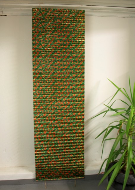 Gedigen veggpryd eller til annet bruk, i friske farger! Flott metallisk uttrykk i rødt, grønt og gull. Lik på begge sider. Overflaten er i plast med et karakteristisk metallutrykk og flott fargespill.