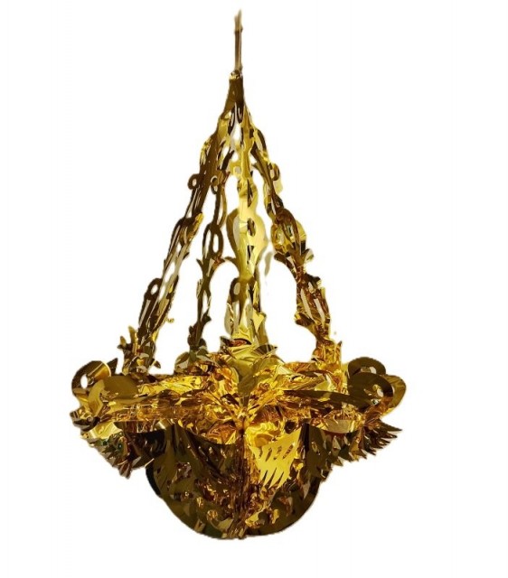 Stor, glitrende glanset "lysekrone" i gull til oppheng i tak. Jule- og nyttårsfestens midtpunkt! Overflaten er i plast med et karakteristisk metallutrykk og flott fargespill.