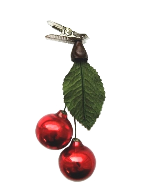 Hengende kirsebær av munnblåst glass med blad og klype. Blåst i gammel, restaurert form.