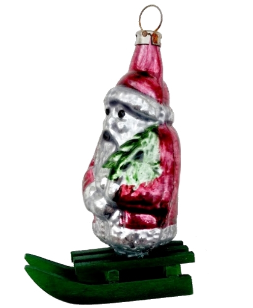 Nisse av munnblåst glass som sitter på malt trekjelke. Håndmalt juletrepynt laget i gammel, restaurert form.