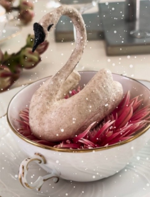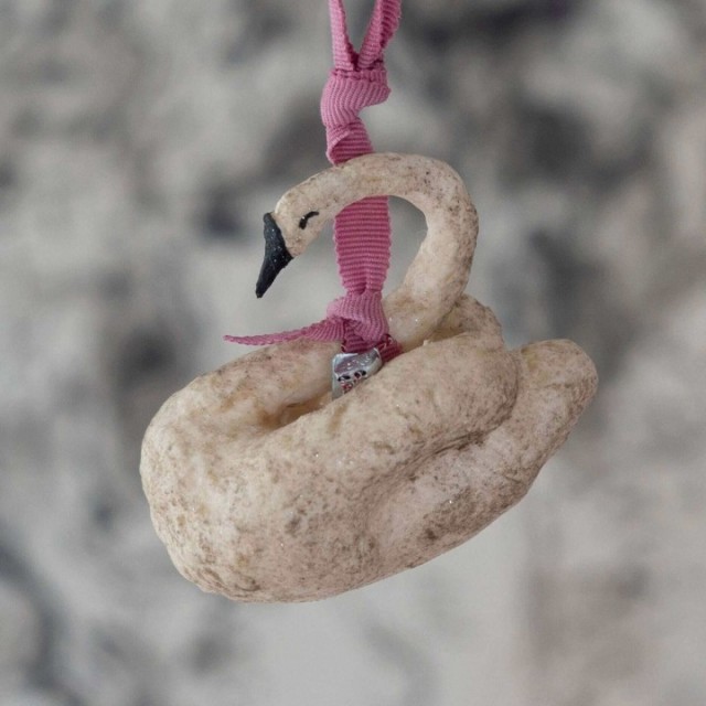 Håndlaget svane av bomull og papir, dekorert med glitter. Ekte nostalgi for juletreet, laget etter et forbilde fra rundt 1910. Håndlaget og med håndmalte detaljer.