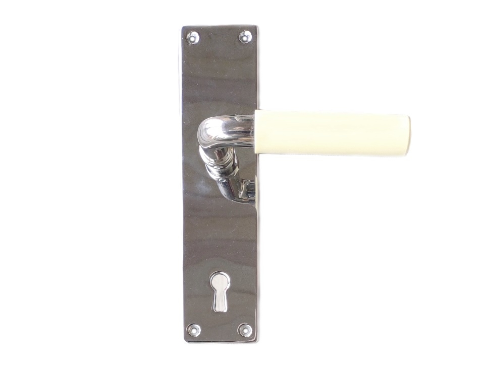 Komplett sett dørhåndtak med forniklet langskilt og benhvitt grep