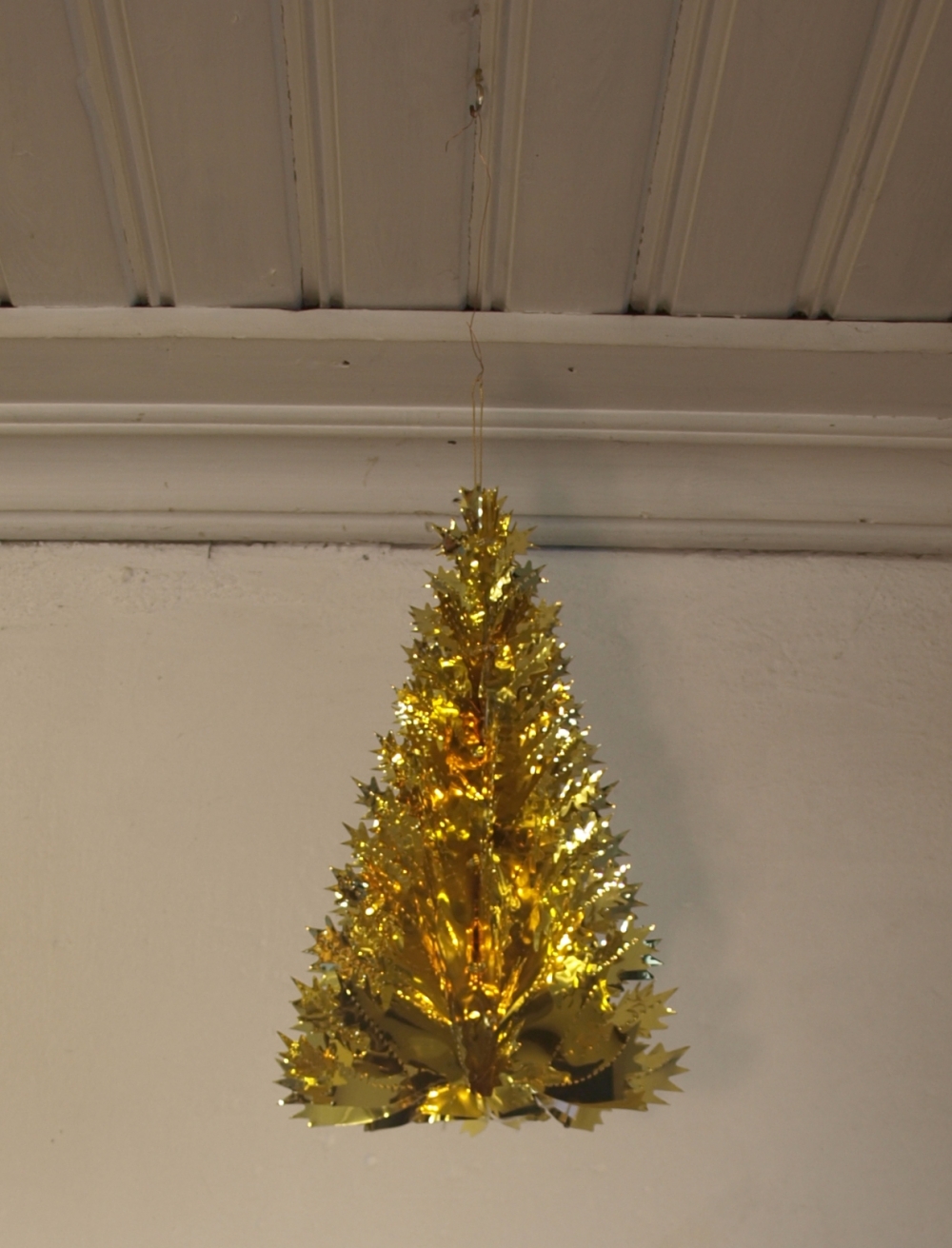 Juletre gullfarget til oppheng, i vinduskarm, på bord e.l. Høyde ca 30 cm og bredde nedkant ca 20 cm.