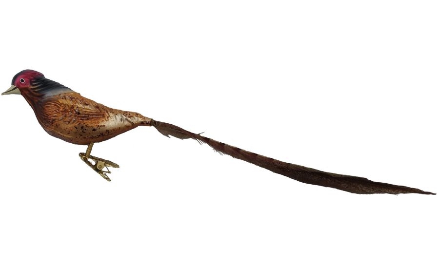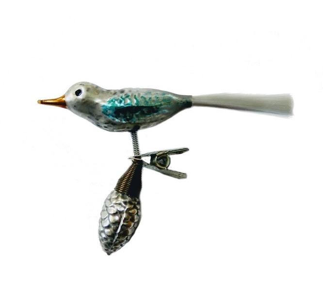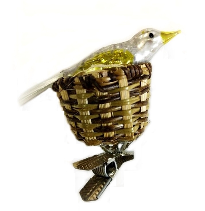 Glassfugl som holder liten kurv i nebbet, munnblåst, lengde 16 cm.
