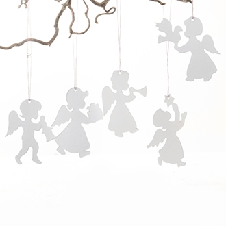 Gammeldagse hvite engler av kartong, dekorative mot granbar.