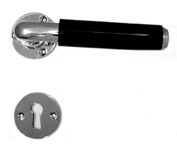 Dørvrider i funkisstil, forniklet messing med sort bakelitthylse, leveres komplett med nøkkelskilt i forniklet messing.