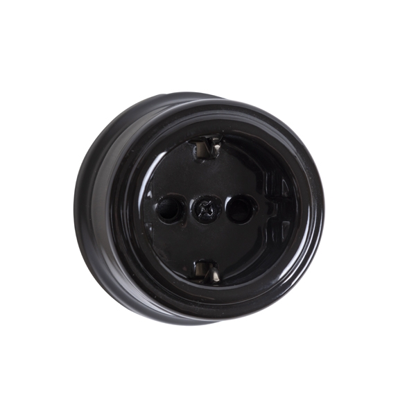 En flott stikkontakt i hel sort porselen, jordet med barnesikring, til utenpåliggende montering.