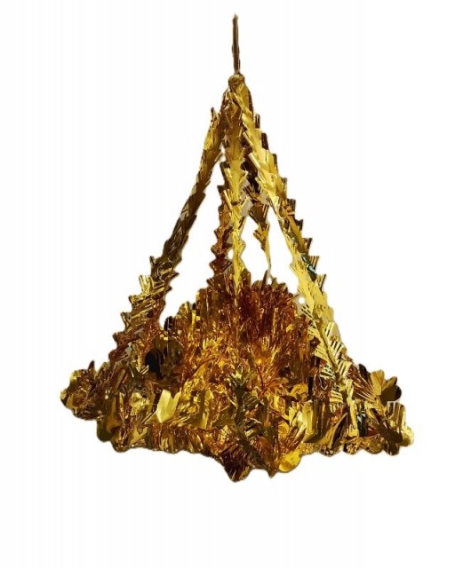 Stor, glitrende glanset "lysekrone" i gull til oppheng i tak. Jule- og nyttårsfestens midtpunkt! Overflaten er i plast med et karakteristisk metallutrykk og flott fargespill.