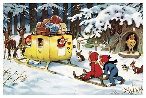 Koselig førjulsgave - nostalgisk postkort med adventskalender med 24 små luker. Konvolutt medfølger. llustrasjon av Fritz Baumgartner.