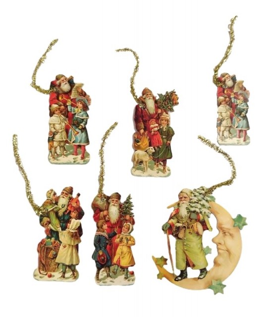 Pakke med 6 stk glansbildefigurer. Motiv på begge sider, glitteroppheng. Glansbilder var mye brukt som julepynt rundt 1900, enten alene som disse, eller som dekorasjon på pynt av vatt eller kreppapir.