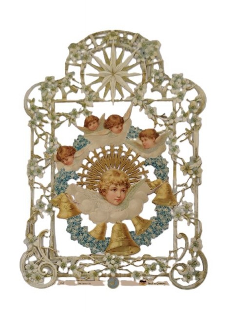 Stort glansbilde med gjennombrutt omramming til juletre eller f.eks vindusdekorasjon. Motiv på begge sider. Opphengsbånd medfølger.