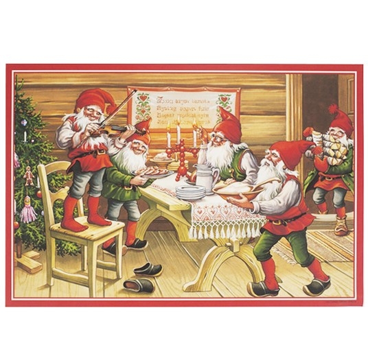Interiørbilde med nisser som feirer jul med juletre, felespill, god mat og gaver.