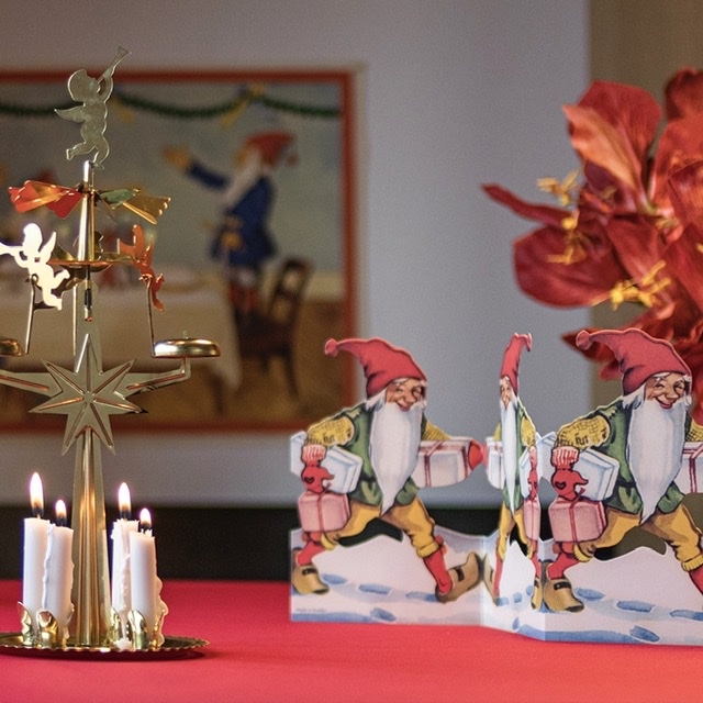 Nostalgisk papirremse med seks nisser. Nissen bærer julegaver.