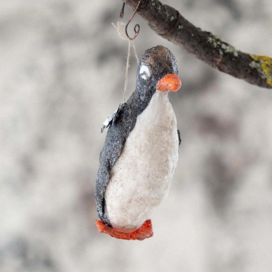 Pynt juletreet som i gamle dager med en pingvin! Håndlaget, av bomull og papir. Laget etter et forbilde fra begynnelsen av 1900-tallet.
