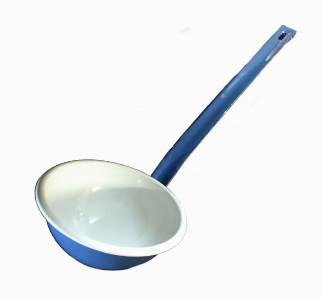 Stor øse i blå og hvit emalje, diameter 11 cm, lengde på skaft 27 cm.